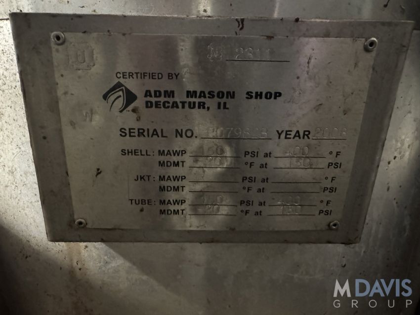 S/N P07982B, SHELL MAWP 150 PSI @ 400 F, MDMT -20 F @ 150 PSI, TUBE SHELL MAWP 150 PSI @ 400 F, MDMT -20 F @ 150 PSI, APROX. 26-1/2 DIA., INCLUDES HEAT CONTROL VAVLE & CONTROL TOP BALL VALVE (410-HX-809)(3RD FLOOR TANK FARM ROOM - HAZLE TOWNSHIP, PA) (RIGGING, LOADING, & SITE MANAGEMENT FEE $5,000)