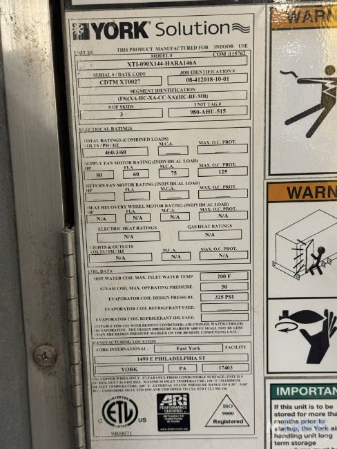 M/N XTI-090X144-HARA146A, S/N CDTM XT0027, 460 VOLTS, 3 PHASE (3RD FLOOR REFINING ROOM - HAZLE TOWNSHIP, PA) (RIGGING, LOADING, & SITE MANAGEMENT FEE $4,500)
