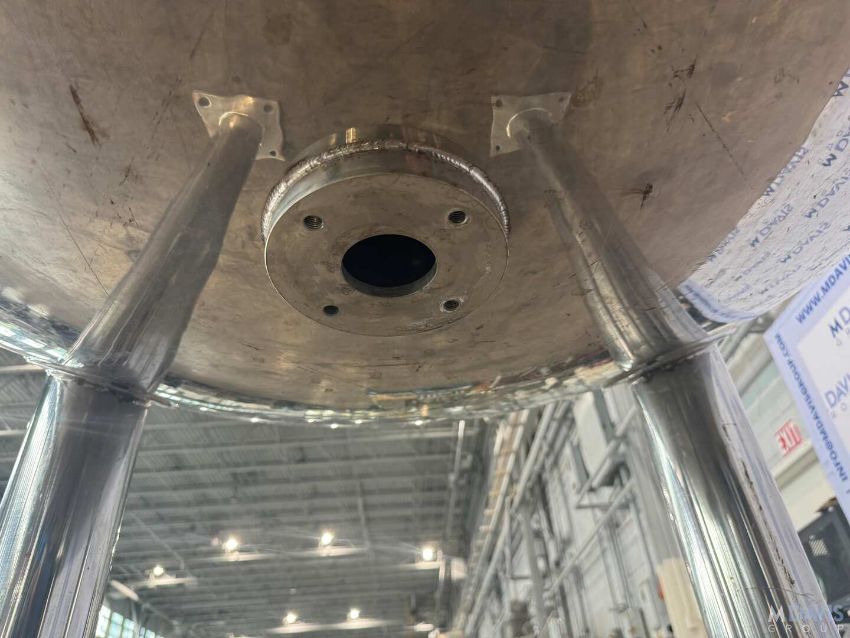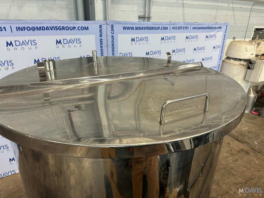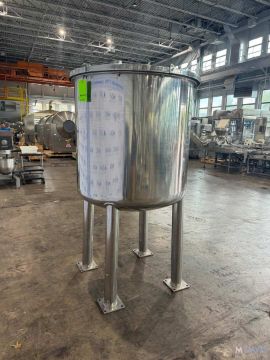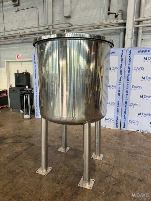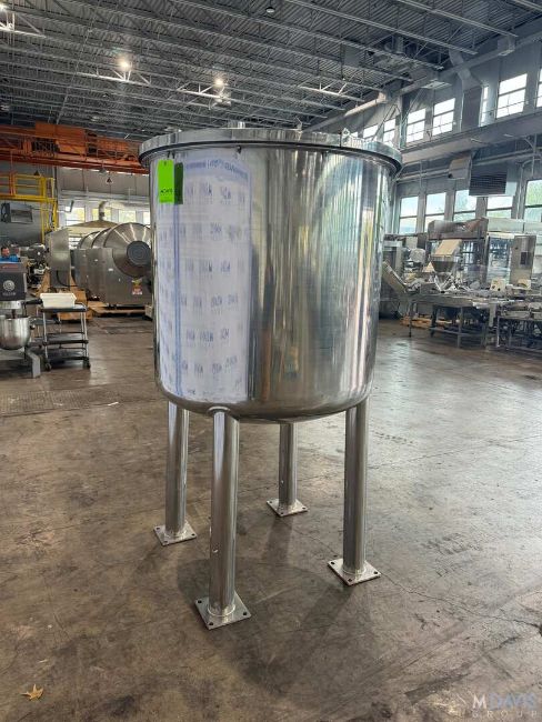 S/S APROX. 200 GAL. S/S VERTICAL TANK, VESSEL DIMS.: APROX. 39 H X 40 DIA., WITH S/S HINGE LID, APROX. 2-1/4 BOTTOM OUTLET, MOUNTED ON S/S LEGS, (RIGGING, HANDLING, LOADING & SITE MGMT FEE: $350.00 USD )