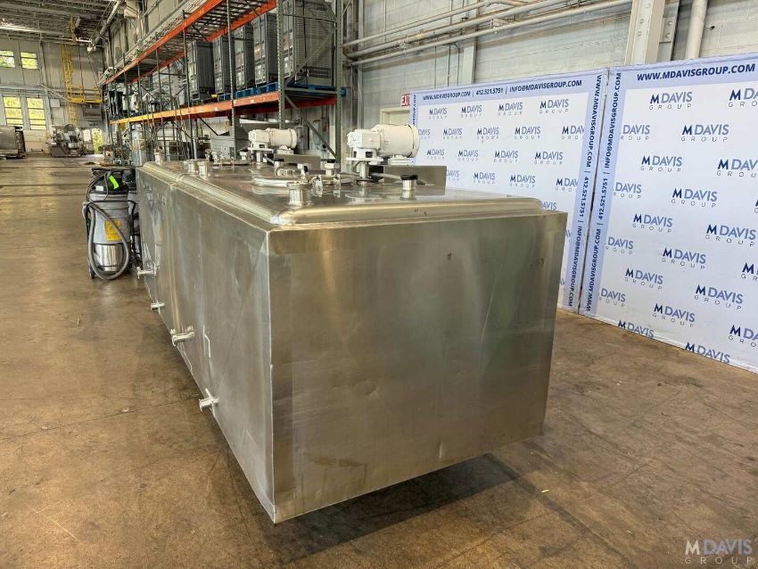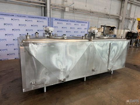 DUAL COMPARTMENT APROX. 450 GAL. S/S FLAVOR TANK, COMPARTMENT DIMS. APROX. 46 L X 67 W X 36 H, WITH S/S VERTICAL AGITATION & 1-S/S CIP SPRAY BALL, OVERALL DIMS.: APROX. 142-1/2 L X 52-1/2 W X 67 H, MOUNTED ON S/S LEGS, (RIGGING, HANDLING, LOADING & SITE MGMT FEE: $700.00 USD )