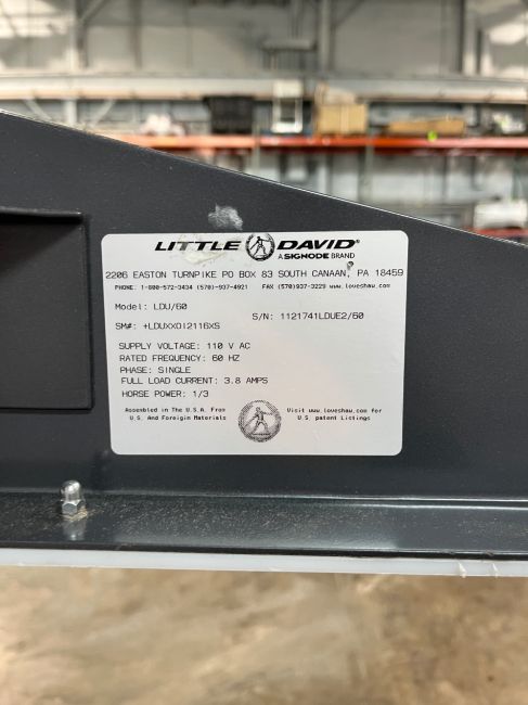 MODEL:LDU/60 S/N:1121741LDUE2/60 SUPPLY VOLTAGE:110V AC RATED FREQUENCY:60HZ SINGLE:PHASE HORSE POWER:1/3, (RIGGING, HANDLING, LOADING & SITE MGMT FEE: $300.00)