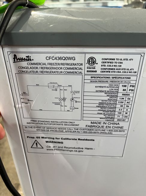 AVANTI COMMERCIAL SLIDING TOP FREEZER OR REFRIGERATOR VOLTAGE:115 60:HZ 2.3A POWER INPUT:120W 2021/07, (RIGGING, HANDLING, LOADING & SITE MGMT FEE: $50.00)