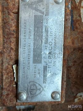 3 HP APV CREPACO CENTRIFUGAL PUMP, S/N S/N:6V-82, 3 HP APV CREPACO CENTRIFUGAL PUMP, (RIGGING, HANDLING, LOADING & SITE MGMT FEE: $100.00)