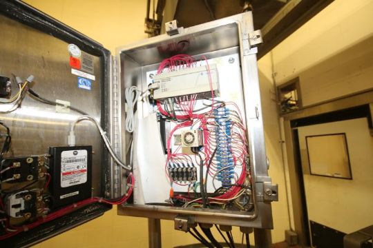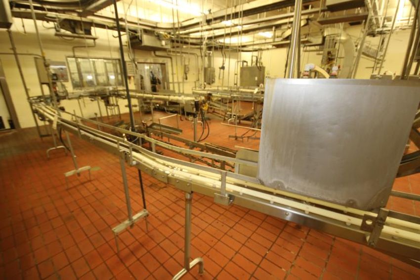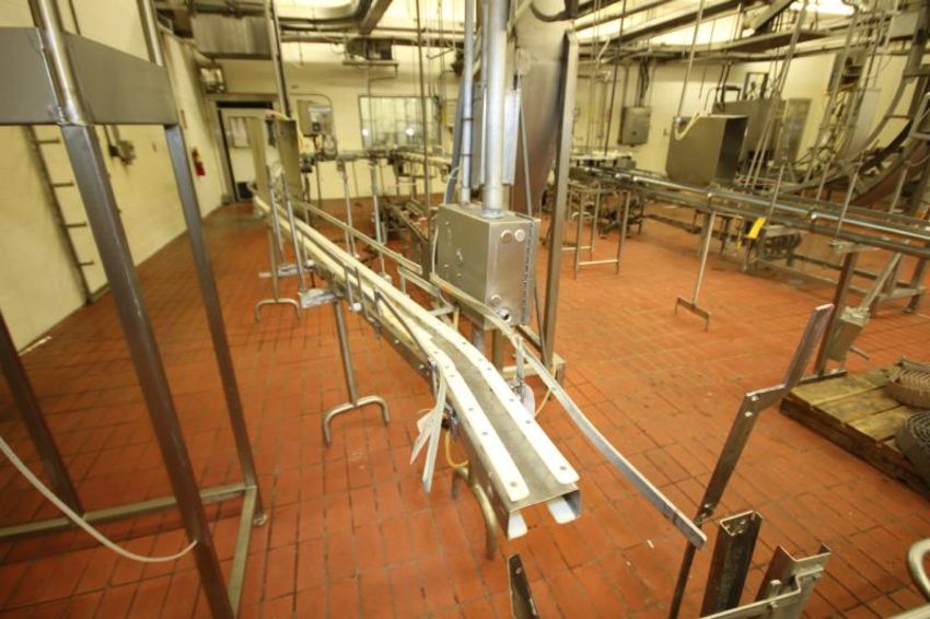Aprox. 45 ft. x 3-1/4" W S/S Product Conveyor with Straight Sections, Bends, Rinse Tunnel, (2) Hydraulic Drives, Combiner, Leg Supports and Allen Bradley PLC Controls with Allen Bradley Micro Display (NOTE: Includes Some 3-1/4" W Chain) ****RIGGING FEE $450.00****