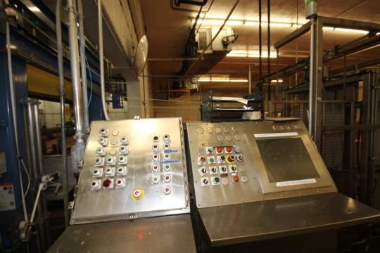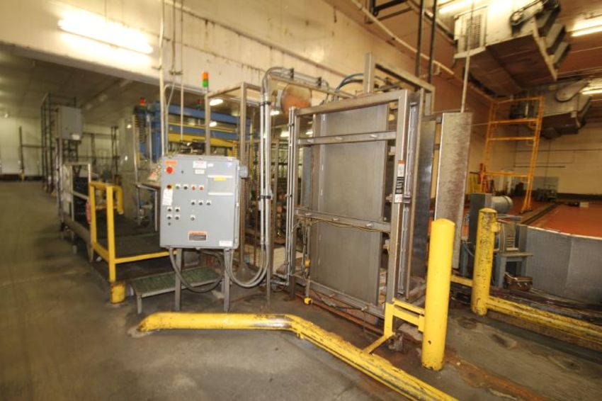 Cannon Hydraulic Case Palletizer, S/N 291 with Pallet Stacker Allen Bradley SLC 5/01 CPU Controls and Endra Heesch-Holland Strapper, Type H2M, S/N 2345 (Located in Cooler)