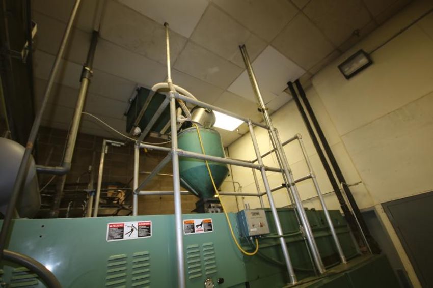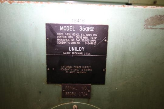 Uniloy 4-Head HDPE Blow Molder, Model 350R2, S/N 350R-2724 with Aprox. 36-1/2" L x 10" H Tie Bar Spacing, Upgraded Air Barrel System, Allen Bradley SLC 500 PLC Controls, Allen Bradley Rockwell VFD Upgrade, Conair Resin Loader, Cooling Bed, Uniloy Trimmer, Model 10026 and AIS Leak Detector, 23579 Metered Hours ****RIGGING FEE $3,600.00****