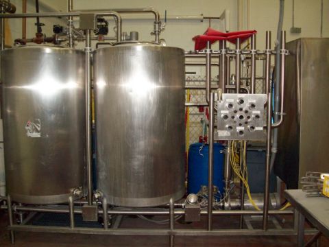 Koss 2-Tank CIP System, (2) 300 Gallon S/S Tanks, Complete with Alfa Laval Solid C-2 Centrifugal Pump, Baldor 10 HP Motor, 3500 RPM, 3 Phase, 480 Volt, (3) 3" Sanitary End Cross Body Valve, Inline Filter, Air Blow Down, 2" Sani End Manifold with 1 main out and 8 Selects, eat Exchanger, Complete Electronics, Maple Systems HMI, Anderson ACT 700 Chart Recorder (LOCATED IN GREEN BAY, WI)***RIGGING FEE $250*** WFOODS