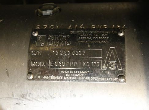 Sine Aprox. 5 hp Positive Displacement Pump, Model EC60WPPTKS173, S/N 132690807, with 6" Clamp Type S/S Head and SEW Drive, Mounted on S/S Frame