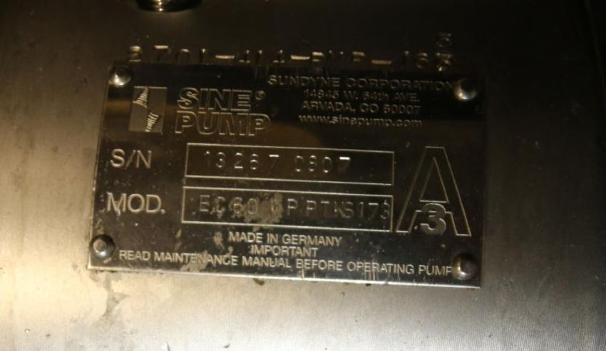 Sine Aprox. 5 hp Positive Displacement Pump, Model EC60WPPTKS173, S/N 132870807, with 6" Clamp Type S/S Head and SEW Drive, Mounted on S/S Frame