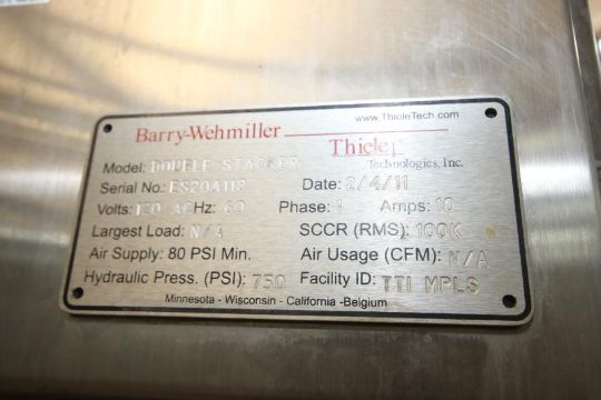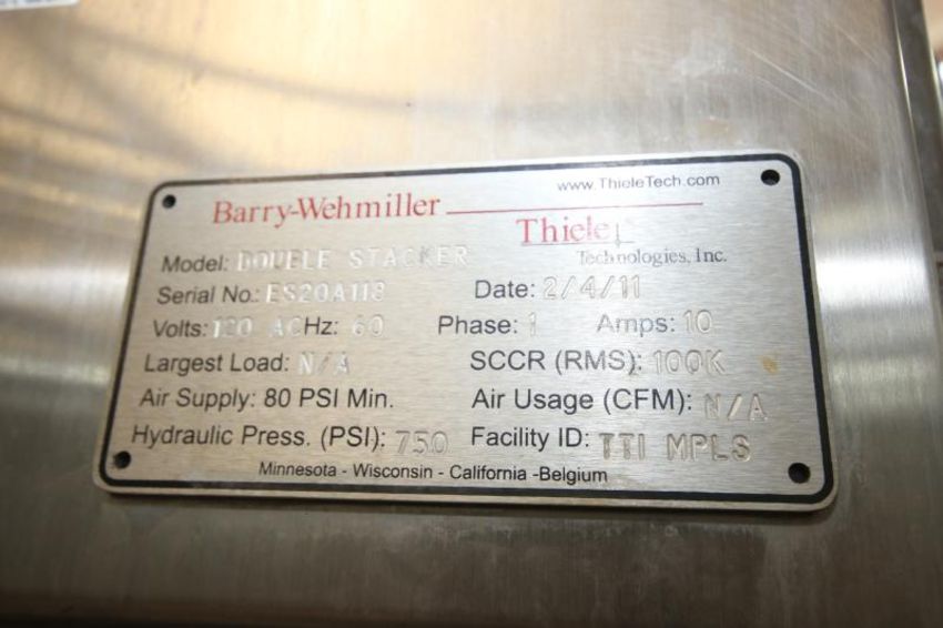 2011 Barry Wehmiller S/S Hydraulic Double Stacker, Model Double Stacker, S/N ES20A118 with Allen Bradley MicroLogix 1000 PLC Controls