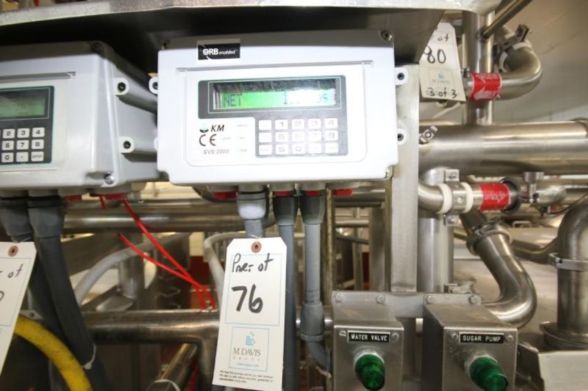 2001 DCI 2,000 Gal. Hinged Lid / Cone Bottom Jacketed S/S Blend Tank, S/N JC0164-B with Bottom Sweep Agitator, Baffle, Dual Sprayballs, Sudmo Air Valve, Mounted on Load Cells with CE KM Model SUS2000 Digital Read-Out, (Tank Dimensions Aprox. 102" W x 142" H)