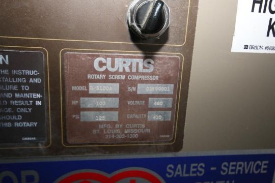 Curtis 100 hp Screw Air Compressor, Model RS100A, S/N 01B99001, 125 psi, Metered Hours 91221 (Compressor #2)