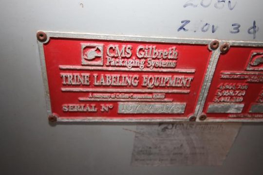 CMS Gilbreth Trine Wrap Around Labeler, S/N 107M45176 with Mitsubishi FX4818 PLC Controls, Smart Touch-Pad Display, Set-Up with 32 oz. Change Parts, Slautterbach Gluer and Spare Parts including Additional Change Parts