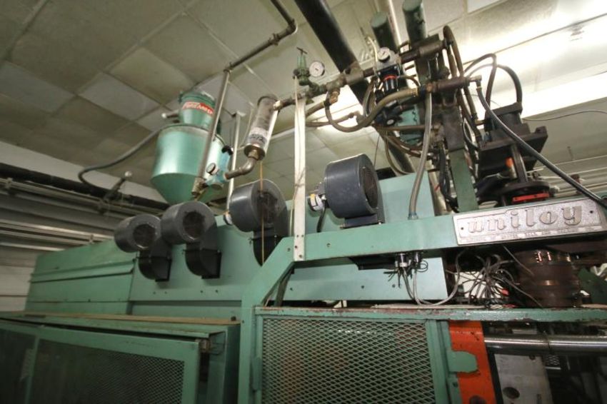Uniloy 4- Head Blow Mold, Model 350R2, S/N 2502, Set-Up with with Platen Size Aprox. 41" L x 15-1/4", Tie Bar Spacing Center to Center Aprox. 36" W, 8" Head Spacing, 2007 Retrofit Kit Installed with Air Barrel Cooling, Allen Bradley MicroLogix 5/03 PLC Controls, Saftronics Starter including Foremost Resin Loader, Cooling Bed, Trimmer Tester, Model 10026D and AIS Leak Detector, (Unit #2)