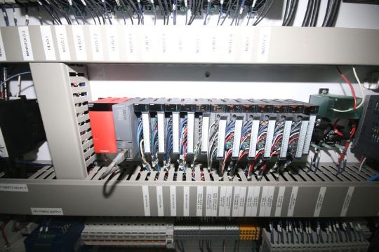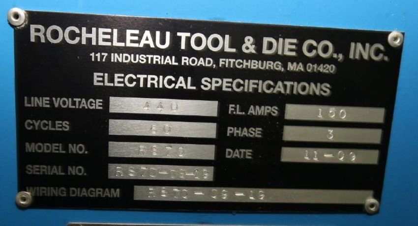 2009 Rocheleau 12-Head HDPE Blower Molder, Model RS70, S/N RS70-09-19 with Aprox. 48-1/2" l X 14" w Platen, 43-3/4" Center to Center Tie Bar Spacing, 3-1.4" Head Spacing, Foremost Resin Loader, Tail Puller HT-1 Spin Trim Take-Away Trimmer, Plastech 8-Station Leak Detector and Mitsubishi Melsec PLC Controls, Mitsubishi VFD's, Model D700 and Mitsubishi GOT1000 Touch-Pad Display, 440 V, 3 Phase (NOTE: Installed But Never Operated!!)