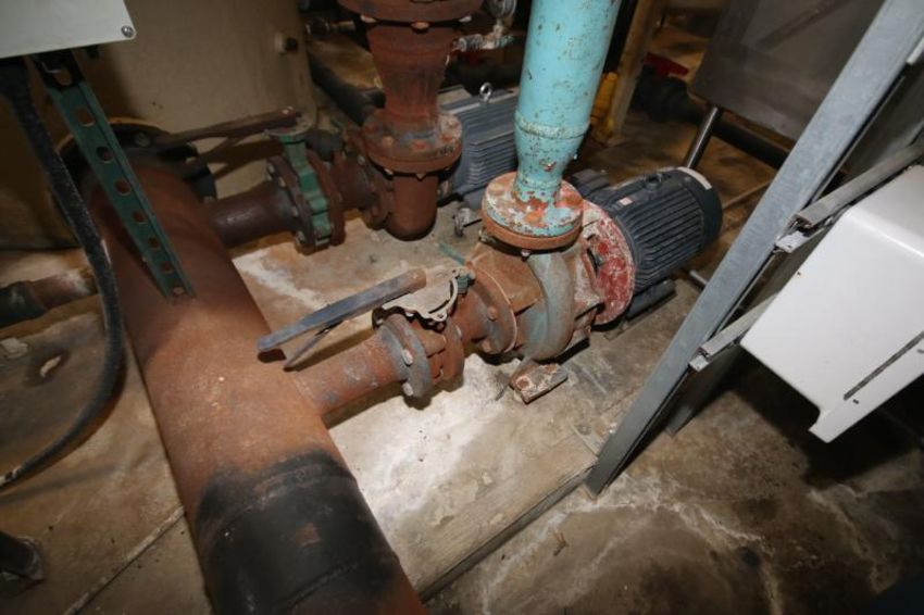 Glas-Tech Aprox. 1,000 Gal. Fiberglass Vertical Tank includes Manifold, (3) Aprox. 3 hp Circulating Pumps - Most Allis Chalmers and Valves (Tank Dimensions Aprox. 88" H x 60" W) (Condenser Cooling Water Tank)
