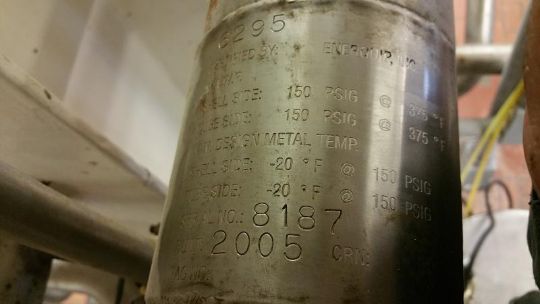 2005 Enerquip Aprox. 43" L x 4-1/2" W S/S Shell & Tube Heat Exchanger, S/N 8187, Board No. 6295, MAWP 150 psi @ 375 Degree F Shell & Tube Side, Min Design Metal Temp. -20 @ 150 psig Shell & Tube