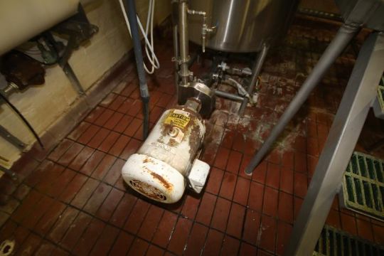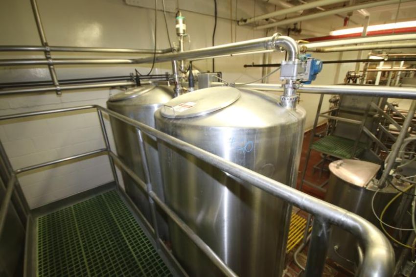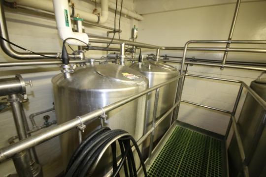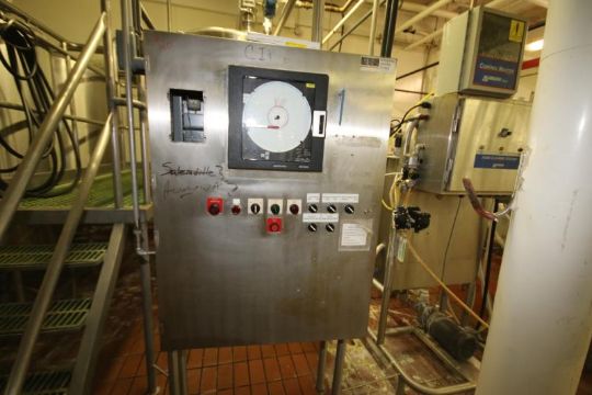 ESE 4-Tank Skid Mounted S/S CIP System, with Aprox. 300 Gal. Tanks 61” H x 38” W, On 2-Skids, Includes Fristam 20 hp Centrifugal Pump, S/S Shell & Tube Heat Exchanger, Tri Clover Air Valves, Endress Hauser Flow Meter, Operators Walk Platform, Allen Bradley 5/03 PLC Controls & Partlow MRC 5000 Chart Recorder, (Located on Main Press Production Floor)