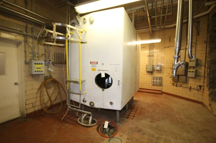 Aprox. 2,000 Gal. Rectangular Insulated S/S Tank, with Vertical Agitator, Sprayball and S/S Legs, Interior Dimensions Aprox. 96" L x 58" W x 88" H, (Aprox. Overall Dimensions Aprox. 8 ft. 7" L x 66" W x 11 ft. Tall To Top of Agitator Motor (Located on Main Production Floor Near Receiving Bay), (Tank #13)