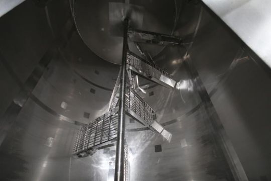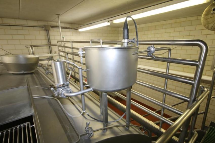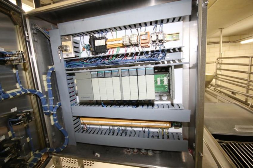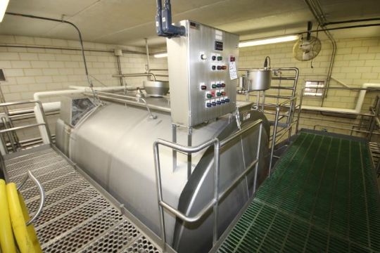 Tetra / Tebel –MKT 50,000 lb. OST Horizontal Enclosed Jacketed S/S Cheese Vat, Model 1973, S/N 9205614, Equipped with Dual Directional Agitators, Agitator Siphon Arm, Rennet Tank and Allen Bradley SLC 5/02 PLC Control Panel (VAT #6)