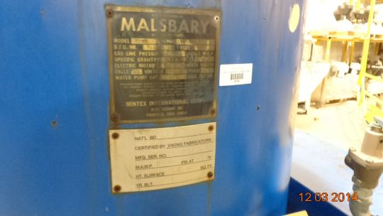 Malsbary Model: 220H 75,000 BTU per hour Natural Gas Hot Water Process Boiler including Externally Wrapped 8 ft tall Vertical Receiving Tank, Etc. S/N: 89153630 ($125 to remove and load) (LOCATED IN IOWA, RIGGING INCLUDED WITH SALE PRICE)***EUSA***