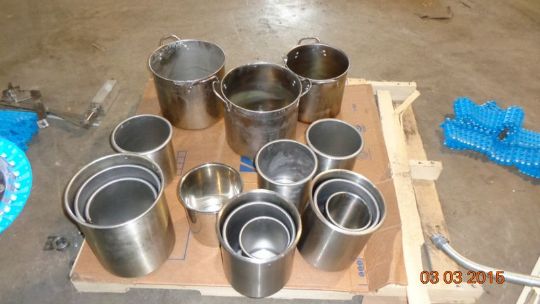 1 pallets of Stainless Steel various size laboratory pots, pail with handle and side handle, pitchers, and graduated cups (LOCATED IN IOWA, RIGGING INCLUDED IN SALE PRICE)***EUSA***