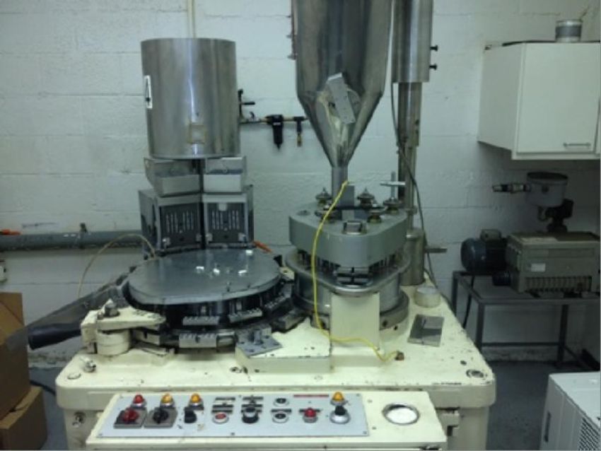 Bosch GFK1200 automatic capsule filling system rated at 70,000 capsules per hour. Complete with #0 size capsule tooling and vacuum pump. All stainless steel and FDA approved contact parts. Machine is in good running condition with the following stations: capsule hopper, capsule sorting and separation, powder hopper with auto powder feeding & dosing, faulty capsule reject, capsule closing, capsule ejection and capsule cleaning. Complete with vacuum pump. Replacement parts are readily available through multiple US suppliers. (LOCATED IN AZ) ***CPPS***