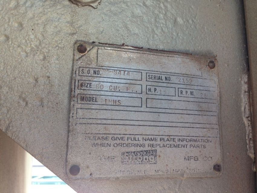 Strong Scott 60CF Dual Ribbon Blender with bottom side discharge. All stainless steel contact parts. 15 horse power drive motor with gear reduction to 29 rpm. Mounted on 48" leg extensions. Three top openings. Stainless steel wall mounted control panel included, Dimensions: - Height 108" - Width 124" - Depth 48" (LOCATED IN AZ)***CPPS***