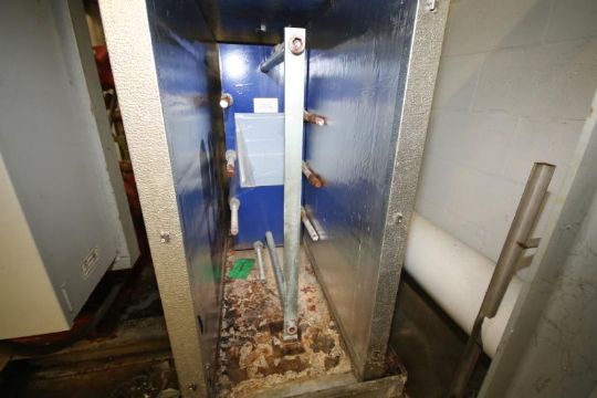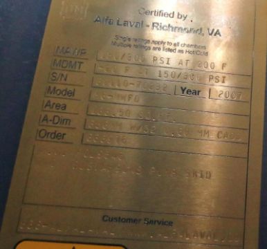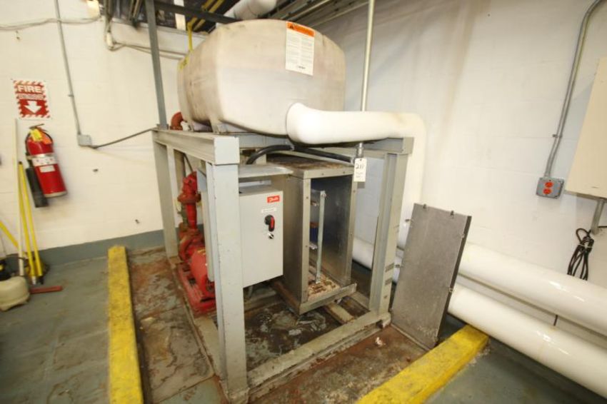 Skid-Mounted Glycol System with 2007 Alfa Laval Plate Press, Model M6-MWFD, S/N 30110-7032, Ammonia Cooled with Armstrong 15 hp Circulating Pump, 150 Gal. Poly Holding Tank and Danfoss VFD