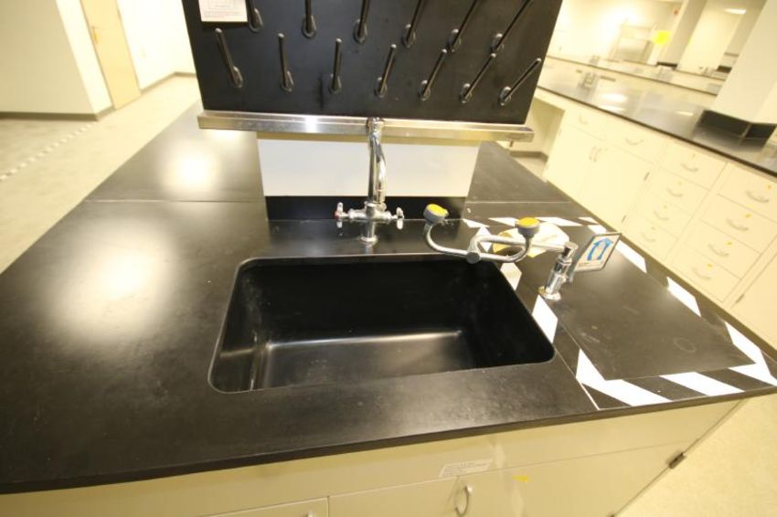 Hamilton Aprox. 266-1/2" L x 36-1/2" H Center Island Double Sided Laboratory Cabinet System with Aprox. 60" W Acid Resistant Top, Sink, Faucet, Eyewash Station including Receptacles (Located Lab #1) (NOTE: Does Not Include Items on Top or Glassware Rack)