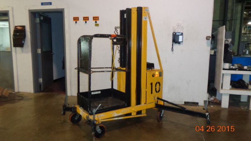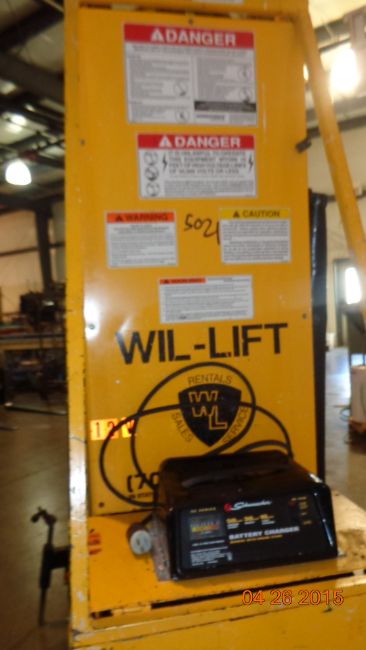 Wil-Lift one-man electric lift with on board battery charger on caster with adjustable outriggers(LOCATED IN IOWA, RIGGING INCLUDED WITH SALE PRICE)***EUSA***
