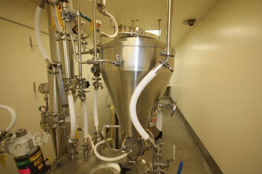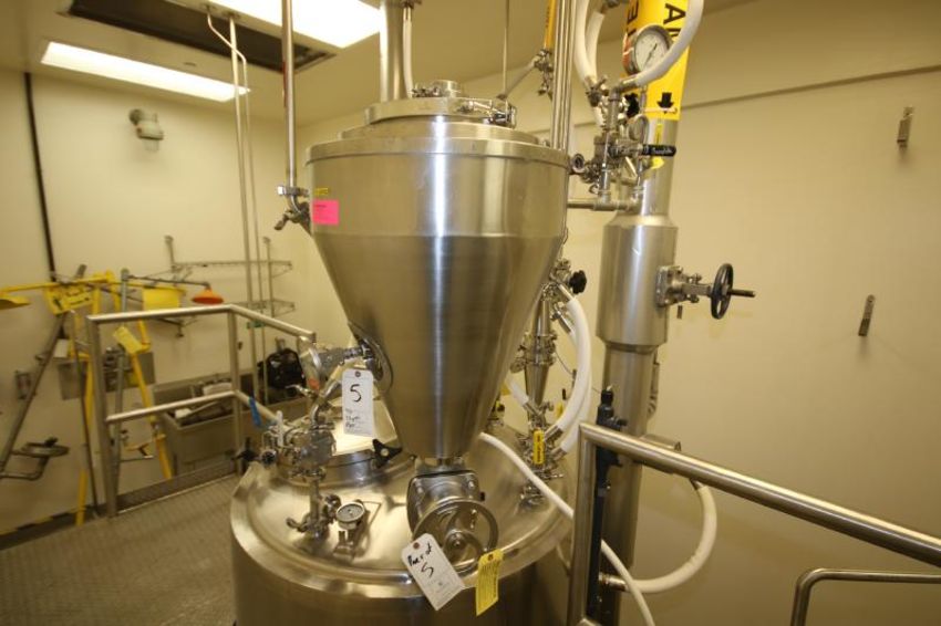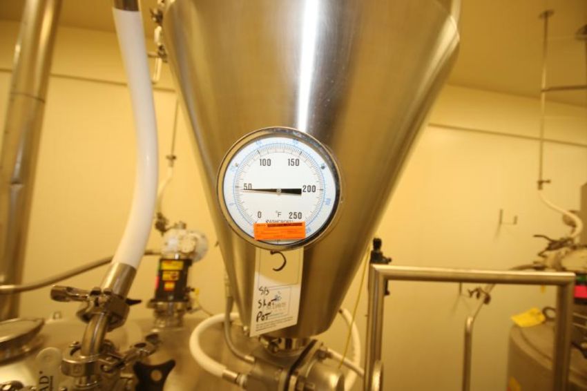 Aprox. 27" H x 24" W Steam Jacketed Nitrogen Injection S/S Shot Pot, S/N TK-340102 with 3" Clamp Type S/S Bottom Outlet includes S/S Gate Valve, Top Mounted Sightglass, Surex 2000 Series 30 psi Stainless Gauge with Swagelok Valve and Ashcroft Thermometer (Located on Item #2) (TK-340301) (LOT LOCATED IN OWINGS MILLS, MD)***STEV***