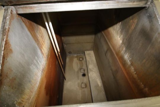 Single Tank S/S 2- Compartment Skid Mounted CIP System, Includes Aprox. 350 Gal. / 200 Gal. Square Tank, with S/S Shell & Tube Heat Exchanger, Tri Clover Air Valves, Chemical Feed Pump System and Some Controls,(Tank Dimensions - 350 Gal. Aprox. 48" Deep x 46" W x 39" H and 200 Gal. Aprox. 48" Deep x 25" W x 39" H) (NOTE: Does Not Include PLC) (Located on Main Floor Lower Production Room) (Tank #47)