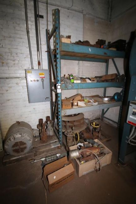 Assorted Boiler and Other Parts including Pump Supplies, Steam Traps, Valves, Aprox. 50 hp Motor including Rack