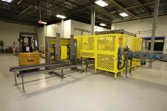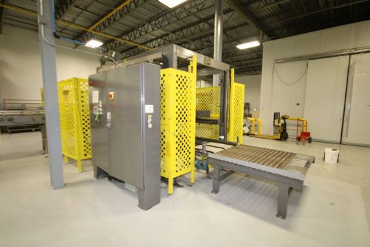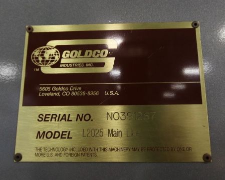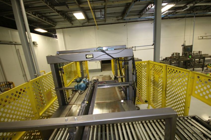 Goldco Low Level Automatic Case Palletizer, Model L2025 Main Line, S/N N0391267 with Empty Pallet Magazine for 36 x 36 and 40 x 48 Pallets, Infeed and Outfeed Conveyor, Siemens Simatic S7-300 PL Controls, (6) Siemens VFDs, Siemens Simatic TP27 Touchpad Display,  (Overall Dimensions Aprox. 9 ft. H x 31 ft. L x 11 ft. W) (Capable of Palletizing at speeds up to 25 Cases Per Minute.)  (Small Footprint)