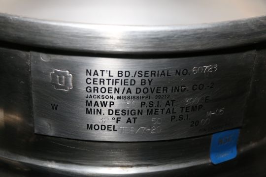 2000 Groen 20 Qt. Jacketed Tilt Type S/S Kettle, Model TDB/7-20, S/N 60723, MAWP 50 psi @ 300 Degree F, Min. Design Metal Temp. 32 Degree @ 50 psi, 208 V, Single Phase, Mounted on S/S Table