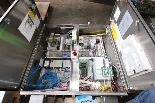 2010 Triangle Multi-Head Linear Scale, Model A918SHF2/R, S/N 120388, with 9-Buckets, Sanitary Grade S/S Frame, Allen Bradley Logix 5561 PLC Controls, Kinetics 6000 Servo Drive and PanelView Plus 1250 Touchpad Display including Change Parts, S/S Leg Supports with Catwalk and Stairs