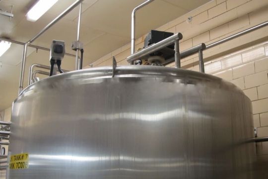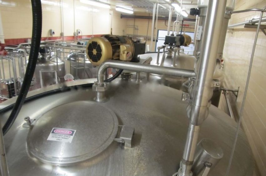 Cherry Burrell 1,800 Gallon SS Processor, Dome Top Sloped Bottom, Top Mounted Agitator, CIP Spray Balls, Side Wall Baffles, Inlet and Outlet Air Valves, Temperature and Level Probe, 80" Diameter x 130" Height (Located in California)***FBEV***