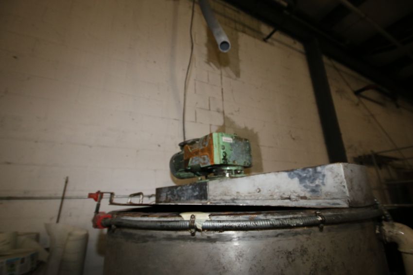 Aprox. 400 Gal. Insulated and Jacketed Vertical Cone-Bottom Steel Lined Chocolate Tank with Top Mounted Agitator, Chromalux Type Immersion Heater and Hinged Lid (Tank Dimensions Aprox. 46" W with Jacket x 64" H To Bottom of Cone) (LOCATED IN IOWA, RIGGING INCLUDED WITH SALE PRICE)***EUSA***
