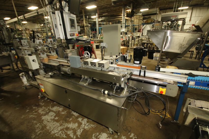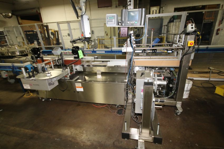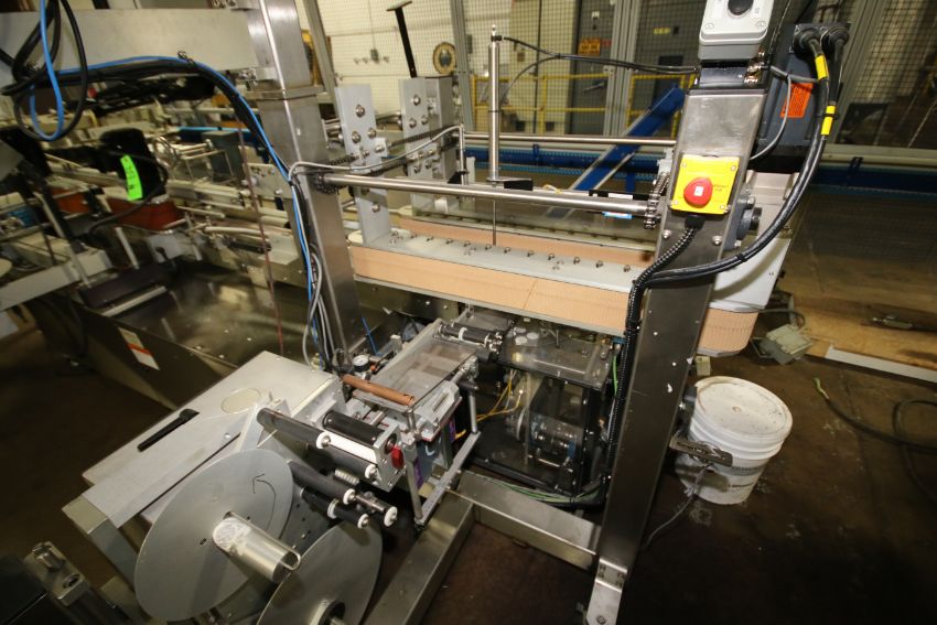 2009 Quadrel Inline Labeler, Model Q65, S/N 79957-01 with (2) Roll Fed Systems Capable of Top and Bottom Labels wit Allen Bradley Logix 5563 PLC Controller, PanelView Plust 1000 Display, PowerFlex 4 VFD's, Emerson Servo Drive with Aprox. 4-1/2" W Plastic Chain Conveyor and Markem Imaje Smart Note 5 Ink Jet Coder (LOCATED IN IOWA, RIGGING INCLUDED WITH SALE PRICE)***EUSA***