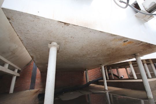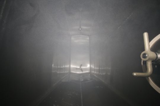 Stainless Inc. 2-Compartment @ 3,000 Gal. Insulated S/S Rectangular Blend Tank, S/N 1803 with S/S Front, Tri-Clover Air Valves, Rear Mounted 3 hp Horizontal Agitator, Temperature Gauges (Overall Dimensions Aprox. 100" W x 9 ft. H) (Overall Dimensions Does not include Agitator or Legs) (Tank #9 and #10) (Asset #67000065 and #67000061)