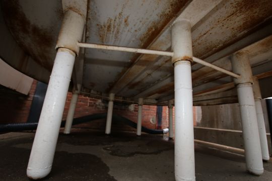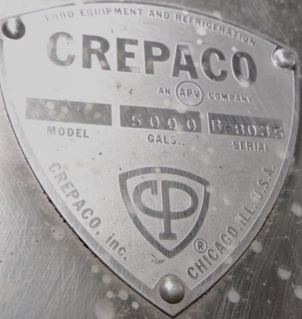 APV 5,000 Gal. Vertical S/S OJ Concentrate Tank, S/N B-8035 with 150 psi Jacket, 25 hp Vertical High Yield Bottom and Side Sweep Scrape Surface Agitator, Ammonia Refrigeration with Exterior Mounted Receiver, In Wall Alcove, 3" Tank Connection, Temperature Gauge and Mounted on Legs (Tank Dimensions Aprox. 12 ft. H x 116" W - Tank Dimensions Do Not Include Agitator or Legs) (Asset #67000066)