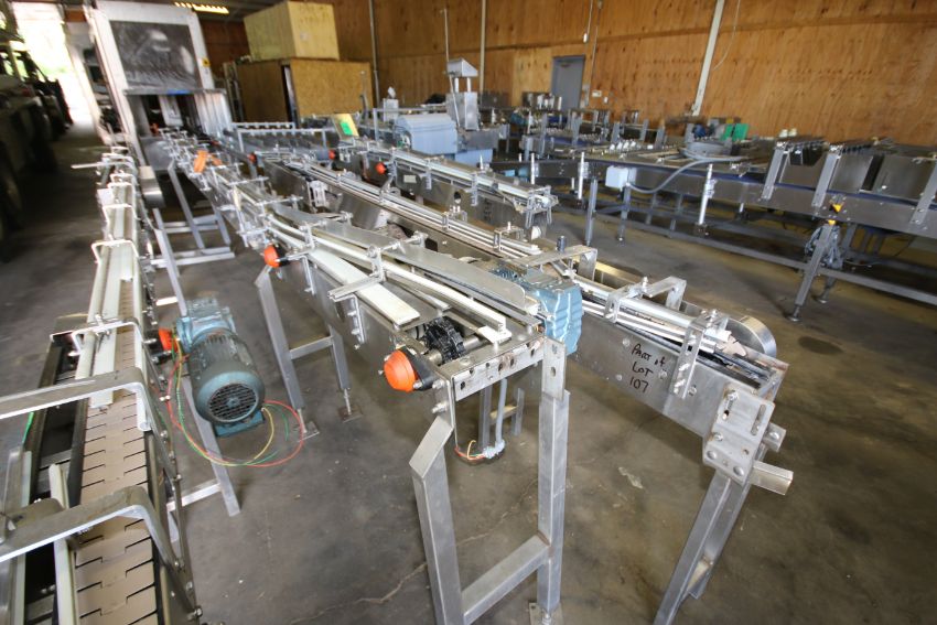 (5) Pcs. S/S Product Conveyor Sections, 3-1/4" W Chain, (4) Straight Sections and (1) 90 Degree Turn, Aprox. Sizes include (1) 17 ft. L, (1) 14 ft. 7" L, (1) 13 ft. 8" L; (1) 9 ft. L and (1) 7 ft. 6" L 90 Degree Piece includes (4) SEW Drives, Some Micro-Switches, Some with Table Top Chain, Adjustable Rails and Leg Supports�, ($200 FOB - Additional Charges for ANY Requested Special Packaging/Skidding)