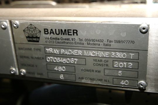 2012 Baumer Tray Packer Machine, Model 3360T, S/N 07645067 with Laner, Allen Bradley Compact Logix L35E PLC Controls, Emerson Digitax Se Servo Drives, 480 V, Allen Bradley PanelView Plus 1000 Touchpad Display and Onboard Donati 250 kg Electric Hoist (Set-Up for Multiple Configurations - (4) 7 oz., (6) 7 oz., (12) 7 oz. and (24) 7 oz.($300 FOB - Additional Charges for ANY Requested Special Packaging/Skidding)