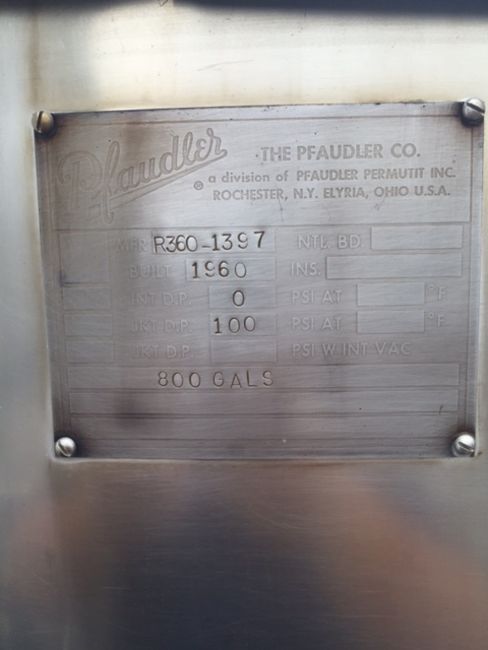 Pfaudler 800 Gallon Top and Bottom Jacketed Mixing Tank, S/N R 360-1397, Triple Blade Agitation, CIP Sprayball, 100 PSI Side and Bottom Jacket (Located in KY & Rigging Included in Sales Price)***JWLS***