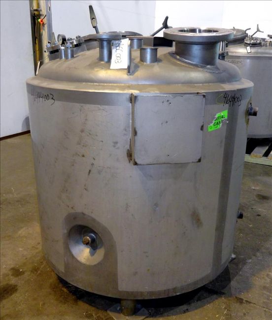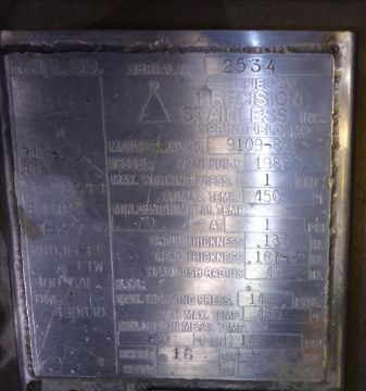 Precision 300 Gallon 316 S/S Reactor, S/N 9109-8,Vertical, 48" Diameter x 40" Straight Side, Dished Top, Sloped Bottom, Internal Rated 1 psi at -20 to 450 degrees F, 304L Stainless steel Dimple Jacket Rated 148 psi at -20 to 450 Degrees F, Openings Top (2) 1-1/2" Threaded, 2", (3) 2" Tri-Clamp, (3) 3" Tri-Clamp, (2) 4" Sight Glass, 8" Off Center Drive, 17" Man Way, No Cover, 1-1/2" Tri-Clamp Side Bottom Outlet, Mounted on (4) S/S Lega National Board# 2534(Located in Illinois)***AMJC***