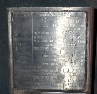 Precision 300 Gallon Vertical Reactor, 316 S/S, Model XJSS-200, S/N 89/379244-02, 48" Diameter x 40" Straight Side, Dished Top, Sloped Bottom, Internal Rated 1 psi at -20 to 450 Degrees F, 304L S/S Dimple Jacket Rated 148 psi at -20 to 450 Degrees F, Off Center Top Entering Lightnin Agitator, No Shaft or Blade, Driven by a 2 HP, 3/60/208-230/460 Volt, 1140 RPM Motre, (1) Spray Ball Assembly. Openings Top (2) 1-1/2" Threaded, 2", (3) 2" Tri-Clamp, (3) 3" Tri-Clamp, (2) 4" Sight Glass, 8" Off Center Drive, 17" man way, No Cover, 1-1/2" Tri-Clamp Side Bottom Outlet, Mounted on (4) stainless steel legs. National Board# 2529 (Located in Illinois)***AMJC***