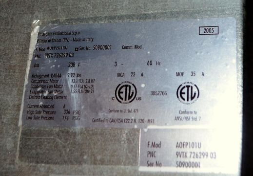 Electrolux Air-O-Chill Blast Chiller / Shock Freezer, Model AOFP101U, 304 S/S, Designed to Accept Hot Products Directly from the Oven, Load Capacity 110 Pounds, (10) 12" x 20" Steam Pans (not included), 13 Gallons, Internal 28" Deep x 35" Tall x 20" Wide, (1) Front Hinged Door, Will Chill from 160 Degrees F, to 0 Degrees F, or Below in Less than 240 Minutes, 3/60/208 Volts, Includes Control Panel, S/N 50900001(Located in Illinois)***AMJC***