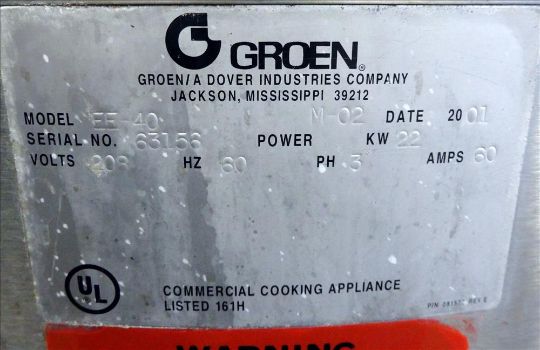 2001 S/S 40 Gallon Groen Kettle, Model EE-40, S/N 63156, 316 S/S, 26" Diameter x 20" Deep, Top Hinged Cover, Hemispherical Bottom, Electrically Heated Steam Jacket Rated 30 psi at 300 Degrees F, 22KW, 3/60/208 Volt, 60 AMPS, Approximate 2" Diameter Sanitary Tangent Drawoff with Valve, Mounted on (4) legs, National Board# 63156 (Located in Illinois)***AMJC***