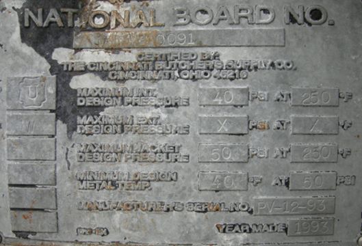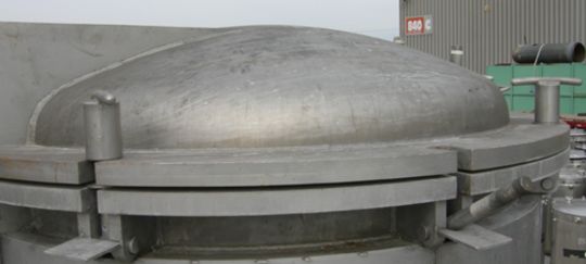 Cincinnati Butchers Supply Company Pressure Tank Blancher, Approximately 750 Gallon, 304 S/S, Vertical. 54" Diameter x 68" Straight Side, Sished Bolt on Air Operated Hinged Top, Dish Bottom, Internal Rated 40 psi at 250 Degrees F, Jacket rated 50 psi at 250 Degrees F, 2" Center Bottom Outlet, Mounted on (4) S/S Legs, Includes (2) 42" Diameter x 60" Deep Removable Baskets with Casters. National Board #91, Serial# PV-12-9 (Located in Illinois)***AMJC***